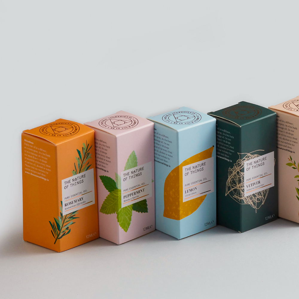 Packaging illustrations and additional illustrative creative assets featured online and in print for The Nature Of Things - An essential oils company based in Ireland who recently won the Best packaging award, 2019. https://www.thenatureofthings.ie/blogs/news/best-packaging-award-jan-2019